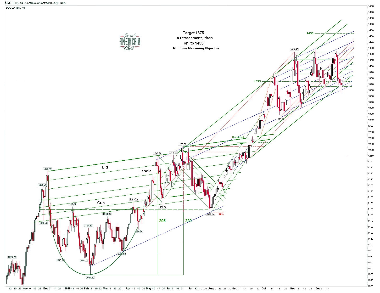Next I’d like to respond to a question from one of my followers. For some reason, I’m having difficulty adding a comment, so I’ll use this forum instead to write a longer response. JB asks, “So I'm curious what you think of the stiff technical resistance we are seeing in gold at $1424. Is this just resistance breaking to a new high? These troughs present good buying opportunities, but I'm concerned that gold is losing it's shine as the equities continue to defy logic and gravity. From Jesse's: http://1.bp.blogspot.com/_H2DePAZe2gA/TSzM7sWHH6I/AAAAAAAAPjk/BrObAxavzy0/s1600/golddaily2.PNG